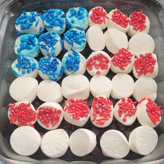 This was such a hit! First, I cut the big marshmallow in half! Then dipped in a little bit of water and rolled in sprinkles. Using blue and red. Next, I layered the pan with chocolate chips and topped the marshmallows on them to look like an American Flag. I baked for about 20 minutes on 350!